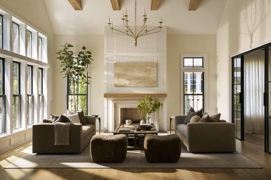 While the architectural framework was already in place, the design team was able to shape key elements, including a custom millwork fireplace surround that adds depth without overpowering the room. From there, the focus shifted to flow, especially as the great room opens directly into the kitchen and dining spaces.